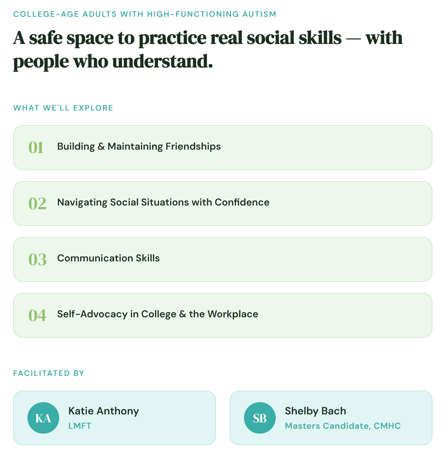 ❋ Social Skills Group forYoung Adults DESIGNED FOR COLLEGE-AGE ADULTS WITH HIGH-FUNCTIONING AUTISM Social situations can feel exhausting, confusing, or just harder than they seem to be for everyone else. You're not alone, and you don't have to figure it out by yourself. Register